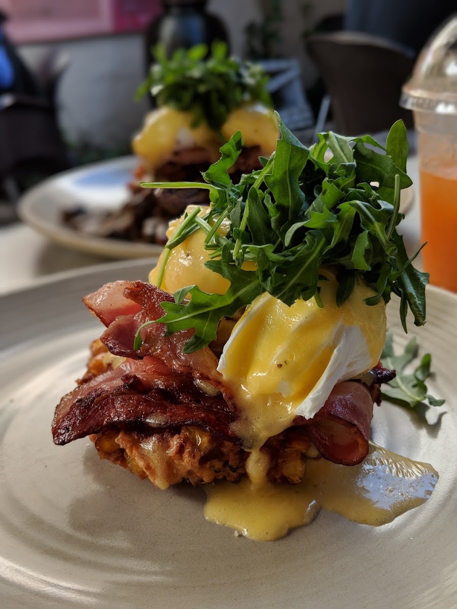 Nice cafe with plenty of seating outside in a back area. Service isn't great, waited 15 to place initial order and after trying for another 10 minutes to get staffs attention to order another coffee, went up to the counter inside and ordered there. There was a table with twin girls nearby who were playing and screaming which was really annoying..though not the cafes fault at all. But the layout of the back area is like a sound trap so we couldn't even talk over the noise so had to wait till they left to chat. Would have left only we had finally ordered breakfast. We were able to get a table without waiting. This could have been due to the noise of the 2 kids screaming in the place, 2 sets of people sat down, and then left.